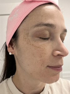 On my right side, I have hyperpigmentation due to pregnancy over the weeks. We can slowly see that it’s fading.